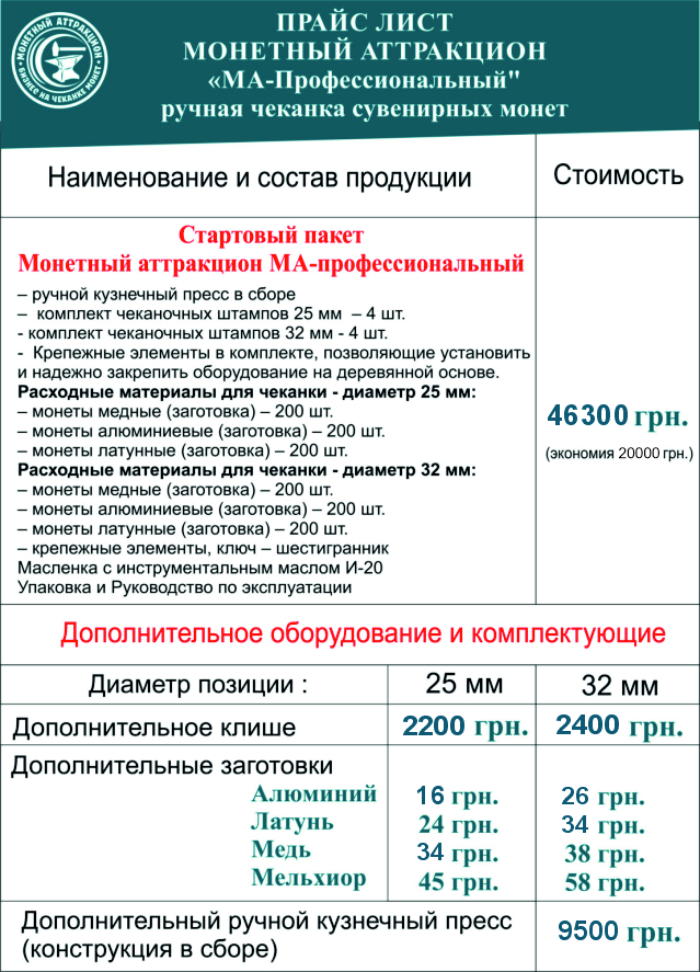 С помощью комплекта чеканочных штампов Вы сможете изготовить одну двустороннюю монету с рисунками, выполненными по эскизам, согласованными с Вами диаметром 25 мм. и одну монету диаметром 32 мм.
